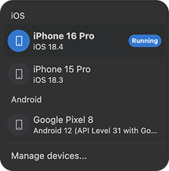 Manage devices - allows to create, delete, and select devices currently running in the device preview.